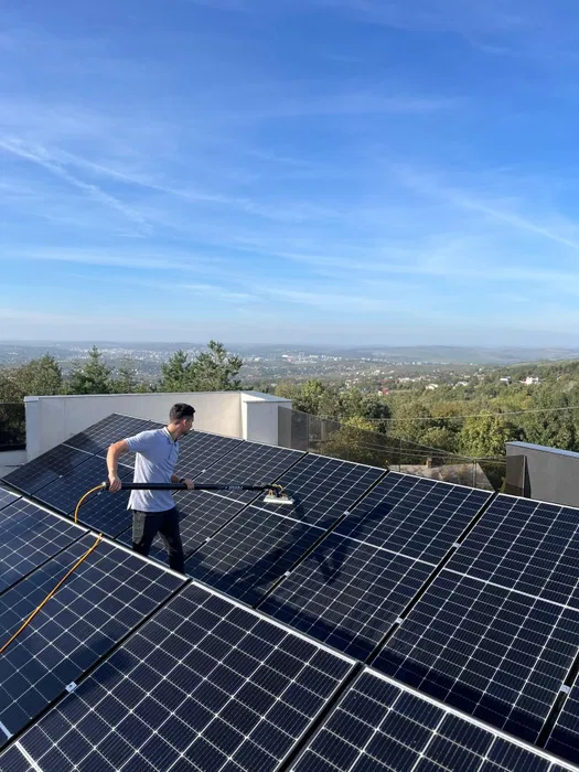 Recomandăm curățarea panourilor solare cel puțin o dată sau de două ori pe an, sau mai frecvent dacă se află în zone cu mult praf sau polen.